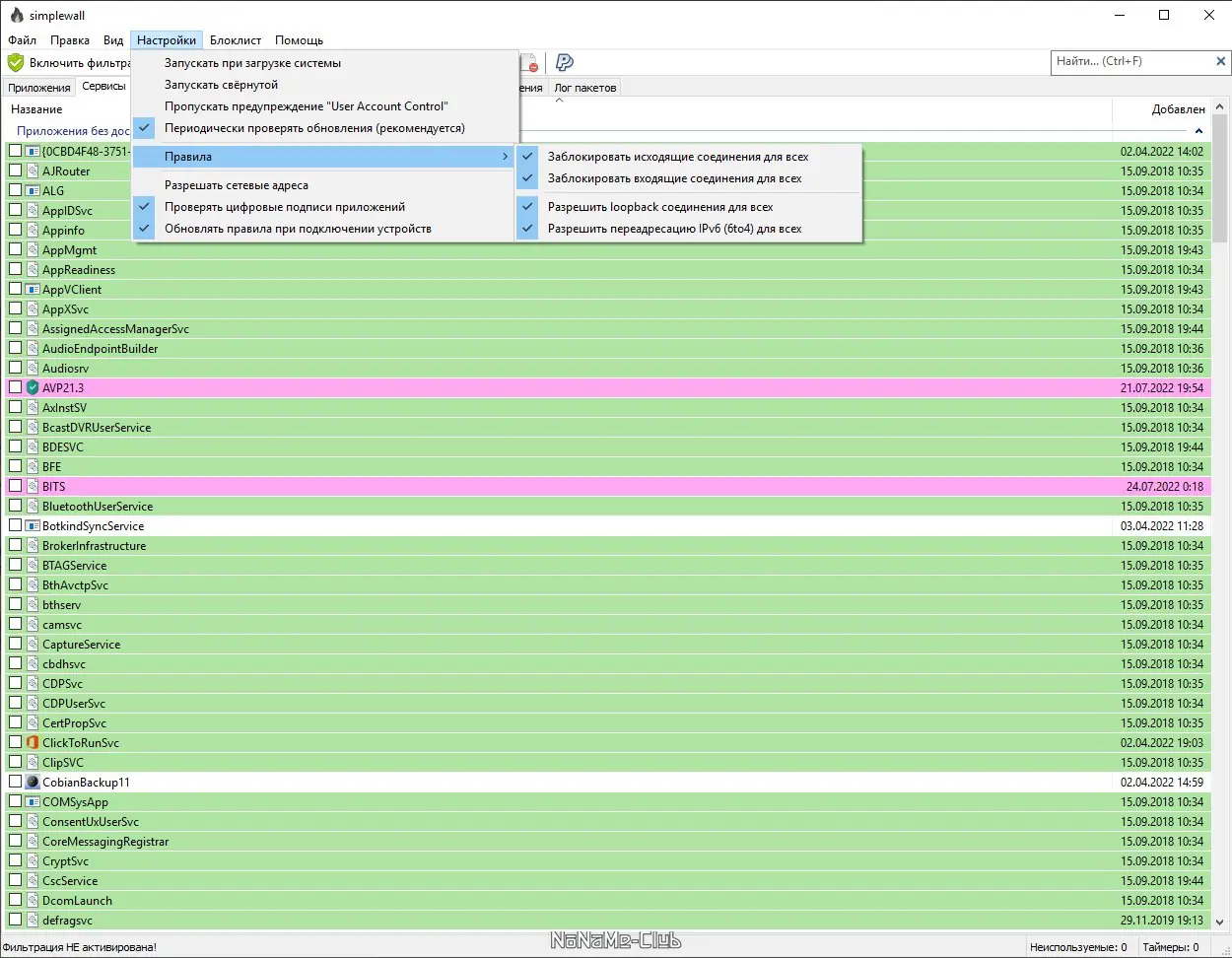 Программа представляет собой компактный фаервол, работающий на базе WFP — технологий фильтрации сетевых пакетов, встроенных в Windows. Это позволяет ей блокировать как входящий, так и исходящий трафик без необходимости в драйверах сторонних разработчиков. Архитектура WFP обеспечивает высокую стабильность и совместимость с различными версиями операционной системы, включая поддержку служб Windows и приложений из Магазина Windows.