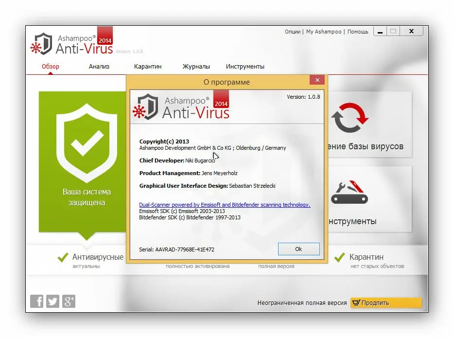 Ashampoo Anti-Virus — это комплексное решение для защиты персонального компьютера от современных киберугроз. Программа сочетает в себе высокую эффективность и минимальное влияние на системные ресурсы, что делает её подходящей как для новичков, так и для опытных пользователей. Благодаря встроенной поддержке двух независимых антивирусных движков — Bitdefender и Emsisoft — обеспечивается максимальная вероятность обнаружения вредоносного кода, включая редкие и ранее неизвестные угрозы.