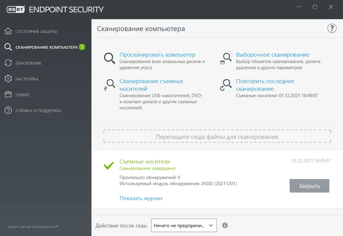 - Включает модуль автоматического сканирования съемных носителей, предотвращающий распространение инфекций через USB-устройства.