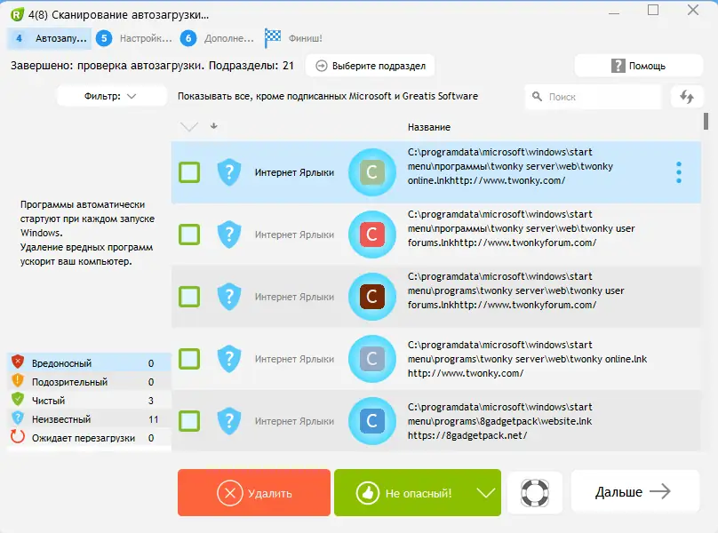 UnHackMe делит все найденные элементы на категории: вредоносные, подозрительные, неизвестные и безопасные, что позволяет принимать взвешенные решения при удалении.