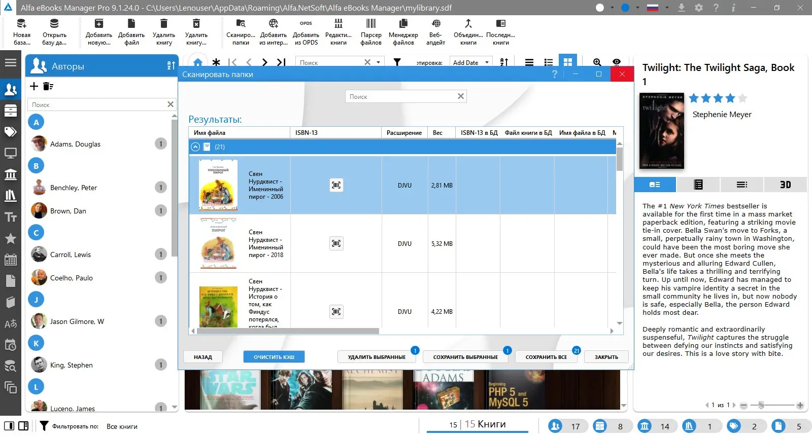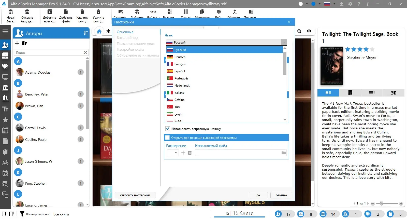 Alfa eBooks Manager — это мощный инструмент для тех, кто стремится привести свою библиотеку в порядок. Программа поддерживает как электронные, так и бумажные издания, позволяя хранить информацию о них в единой базе. Каждая книга может быть снабжена обложкой, аннотацией, списком авторов с указанием их роли, жанрами и тегами. Благодаря гибкой системе полей, пользователь может настраивать карточки под собственные нужды, включая добавление пользовательских атрибутов.