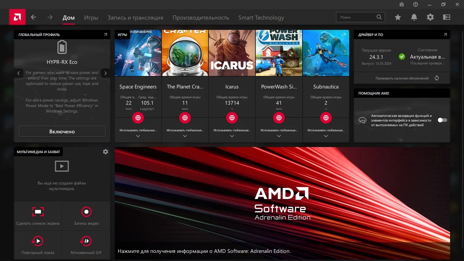 AMD Radeon Software Adrenalin Edition — это комплексное программное обеспечение для управления графическими настройками видеокарт серии Radeon. Оно предоставляет расширенные инструменты для оптимизации производительности, улучшения качества изображения и трансляции игрового процесса. Интерфейс доступен как на рабочем столе, так и в игре, обеспечивая удобное взаимодействие без необходимости выхода в меню.
