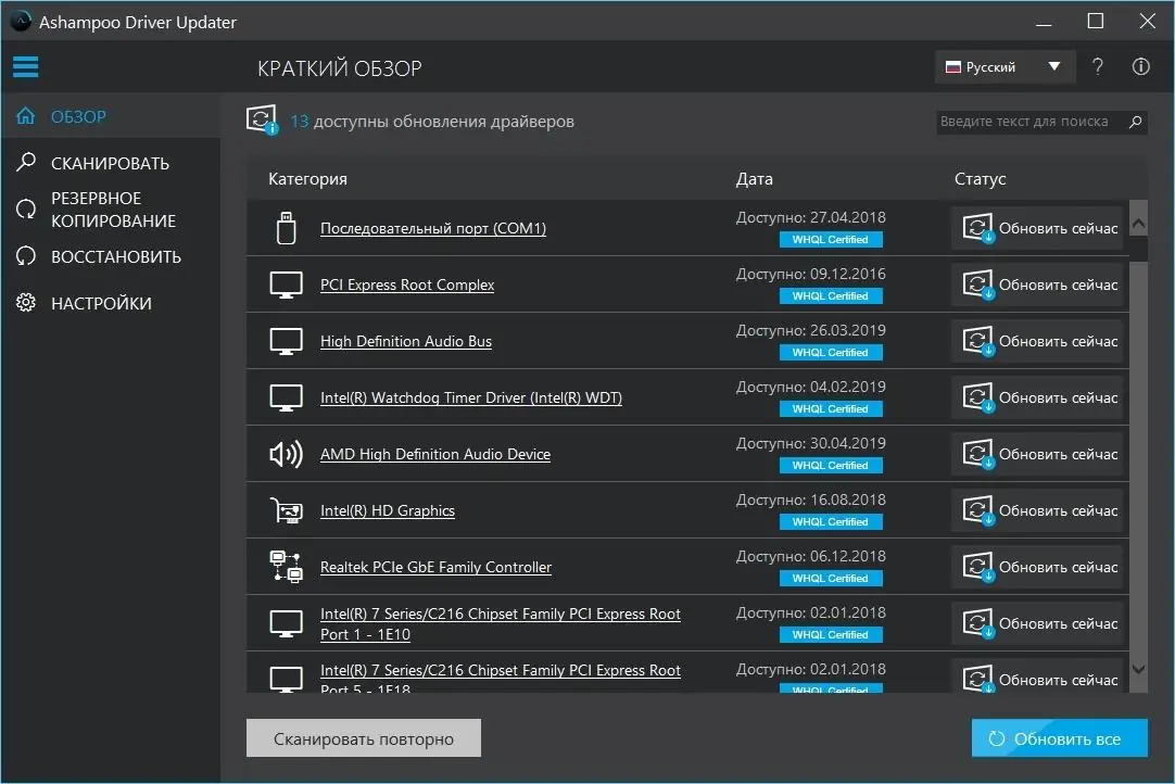 Интерфейс программы прост и интуитивно понятен. После запуска Ashampoo Driver Updater выполняет автоматическое сканирование системы, определяя все установленные устройства и версии их драйверов. Результаты отображаются в виде списка, где указаны устаревшие, отсутствующие или потенциально проблемные компоненты. Пользователь может выбрать обновление всех драйверов сразу или вручную указать нужные элементы для замены.