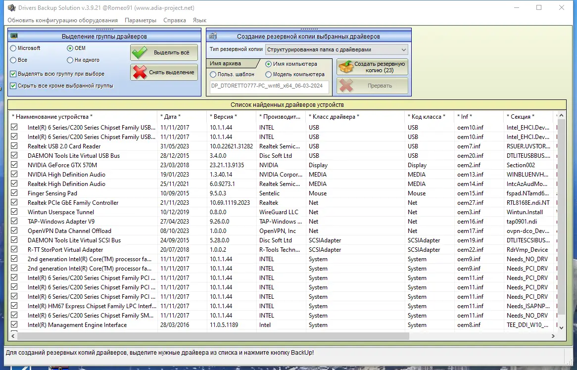 - Присутствует инструмент Drivers Backup Solution для создания резервных копий уже установленных драйверов