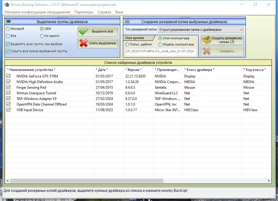 - Утилита Drivers Backup Solution обеспечивает резервное копирование уже установленных драйверов перед обновлением