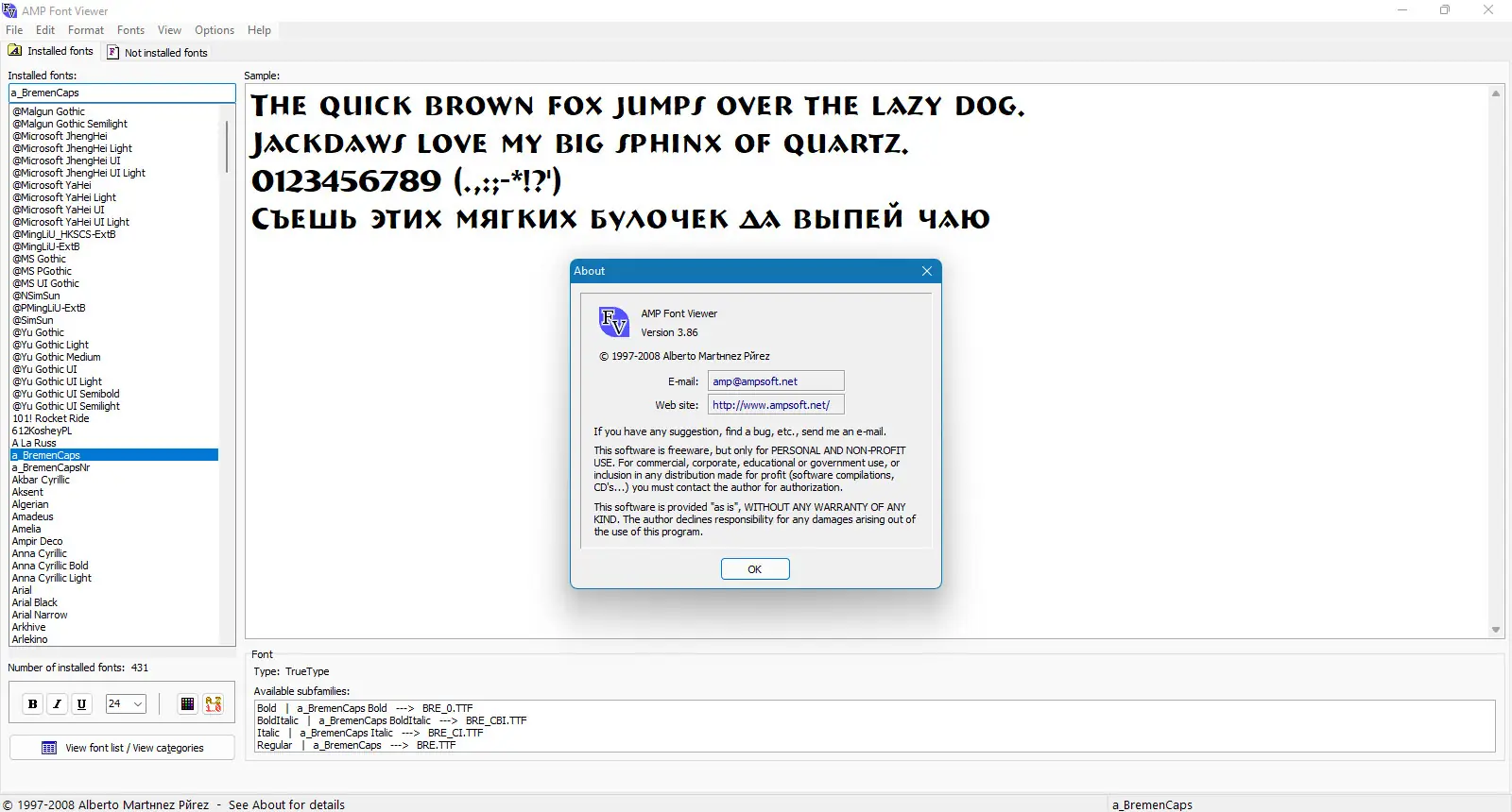 AMP Font Viewer — это компактный и эффективный инструмент для просмотра, управления и организации шрифтов на компьютере. Программа поддерживает различные форматы, включая TrueType, OpenType и Type1, и позволяет работать как с установленными, так и с неустановленными шрифтами. Она предлагает удобный интерфейс, функции группировки, предварительного просмотра и печати, а также поддержку портативного режима.