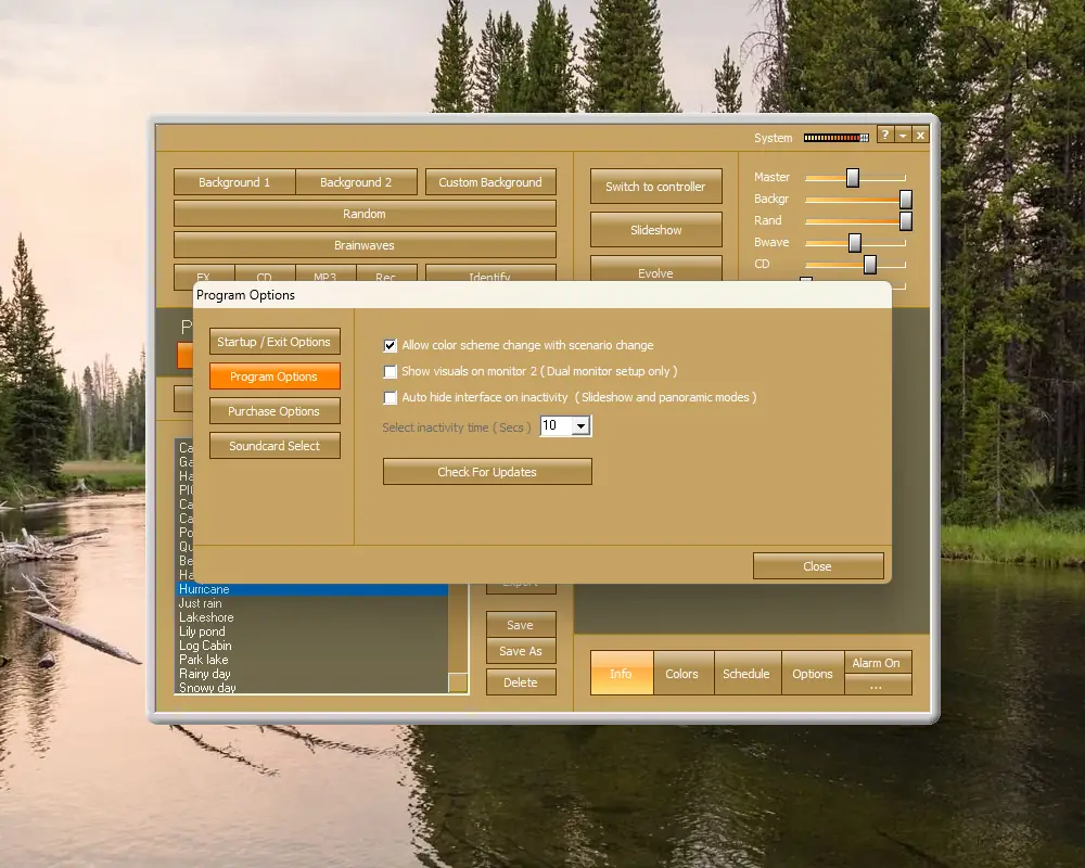 Запуск программы сопровождается выбором одной из встроенных звуковых тем или созданием собственной композиции. Пользователь может добавлять или удалять отдельные звуки, регулировать их громкость и задавать временные параметры. Для персонализации доступен режим автоматического изменения темы в течение заданного времени.