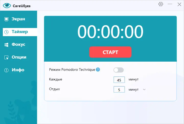 CareUEyes — это утилита для защиты зрения, снижающая нагрузку на глаза за счёт регулировки цветовой температуры и яркости экрана, а также напоминания о регулярных перерывах. Программа автоматически адаптирует отображение изображения в зависимости от времени суток и режима использования. Подходит для тех, кто работает за компьютером длительное время.