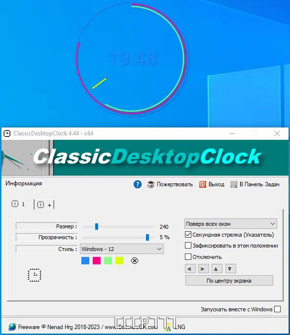 Программа доступна для скачивания в официальной сборке с поддержкой русского языка и портативным режимом работы. Совместима с актуальными версиями Windows, включая 11-ю и 10-ю, как в 32-, так и в 64-битных редакциях. Установка не требуется — достаточно распаковать архив и запустить приложение. Конфигурационный файл создаётся автоматически, а при необходимости его можно перенести для работы на других устройствах. ClassicDesktopClock — это продуманный инструмент для тех, кто хочет видеть время всегда под рукой, не жертвуя производительностью или эстетикой.