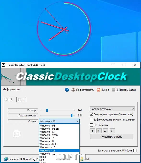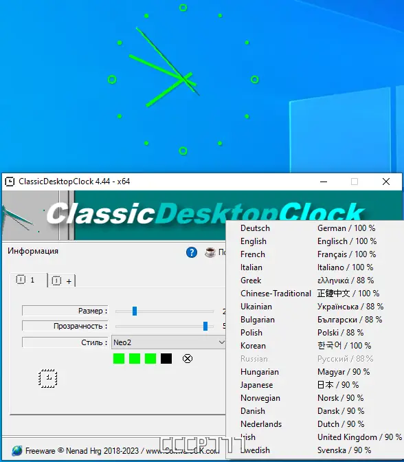 ClassicDesktopClock — это легковесные аналоговые часы для рабочего стола с поддержкой тем, настройкой прозрачности, цветовой гаммы и свободным размещением на экране. Приложение работает без установки, потребляет минимальные системные ресурсы и доступно на множестве языков, включая русский. Идеальное решение для пользователей, ценящих стиль и функциональность в мелочах.
