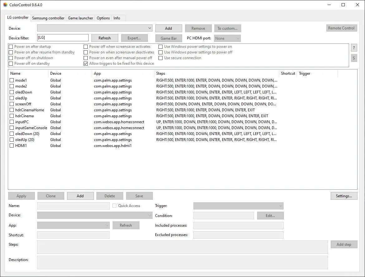 После запуска программы интерфейс отображает все доступные дисплеи и связанные с ними параметры. Пользователь может создать новый пресет, задав нужные значения яркости, контрастности, цветовой температуры и других настроек. В разделе HDMI Settings доступны параметры, влияющие на передачу сигнала, включая выбор цветового стандарта и типа контента. Для моделей мониторов LG реализована поддержка функции Super Resolution, улучшающей чёткость изображения. Каждый пресет можно привязать к глобальной комбинации клавиш, что позволяет мгновенно применять нужные настройки без необходимости открывать приложение. Обновлённый интерфейс заменяет кнопку добавления режимов на более точный элемент, позволяющий добавлять один настраиваемый пресет за раз.