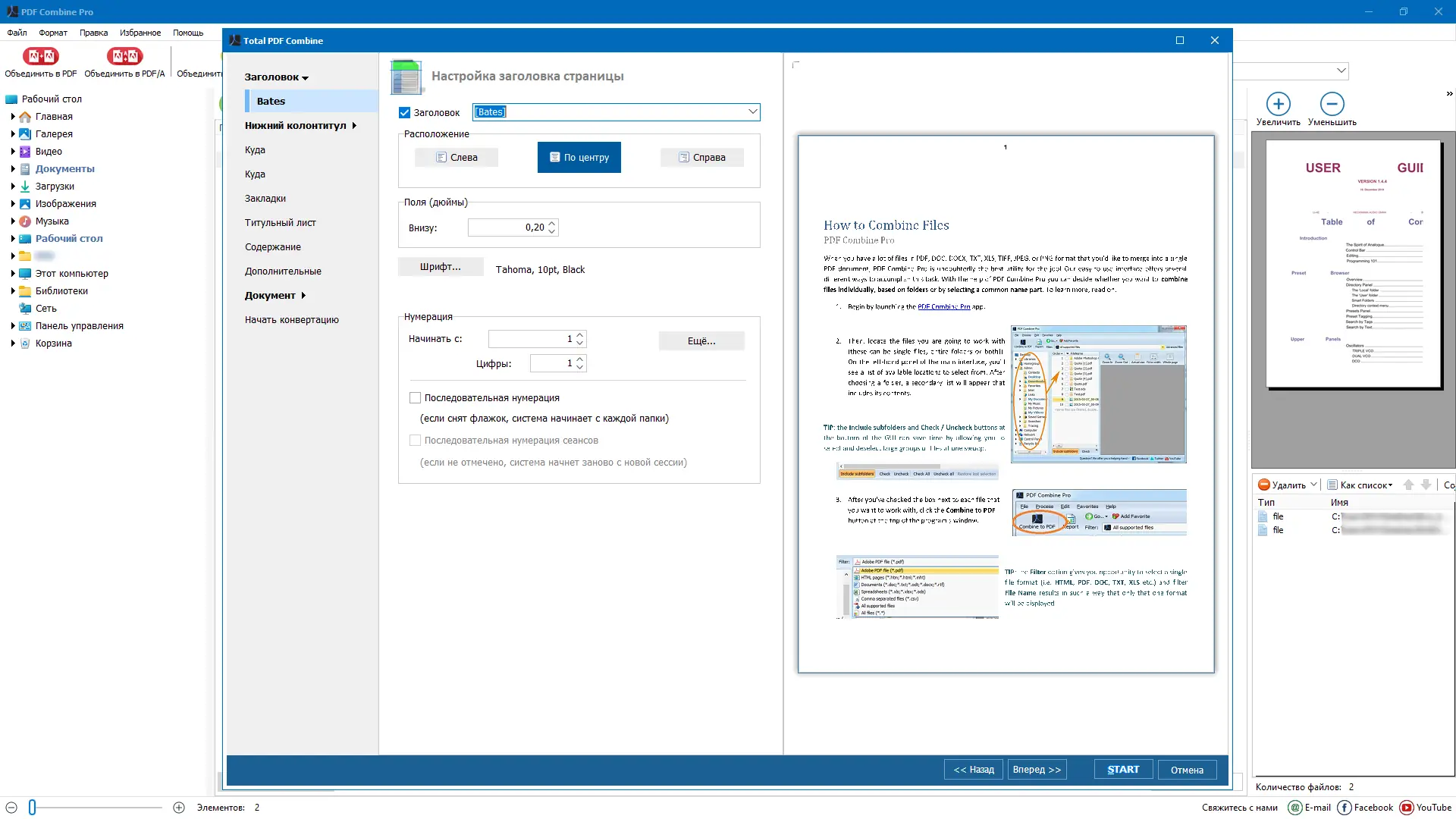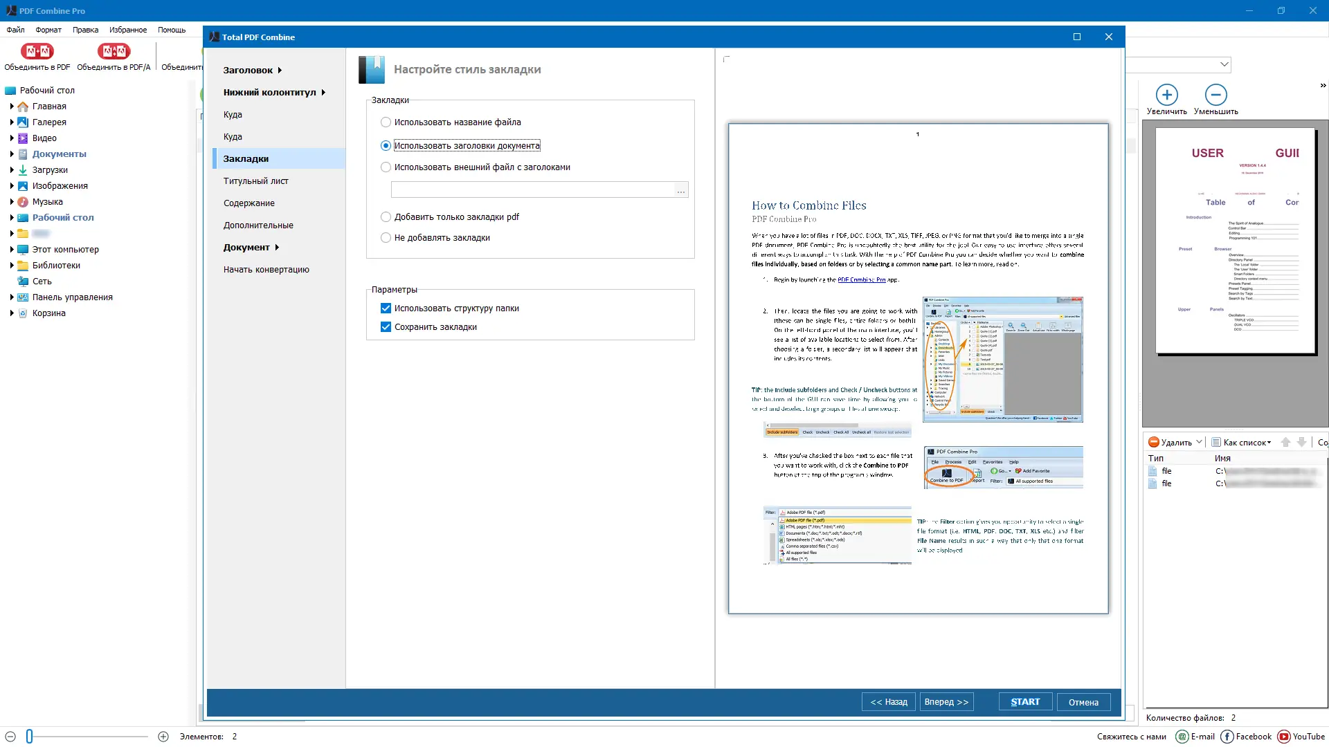 - Гибкие опции структурирования PDF: закладки, нумерация, титулы