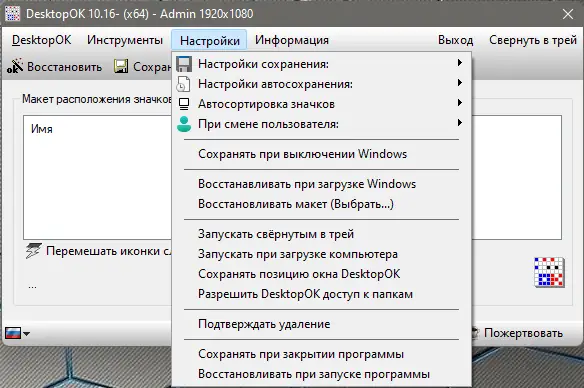 - Автоматическое сохранение позиций иконок при изменении разрешения экрана