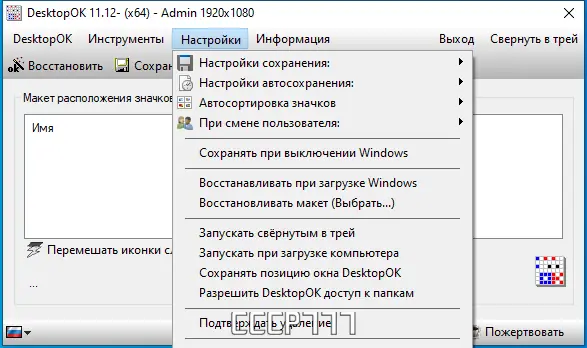 DesktopOK — компактная портативная утилита для Windows, позволяющая сохранять и восстанавливать расположение иконок на рабочем столе после смены разрешения экрана или перезагрузки системы. Программа не требует установки, работает быстро и экономит ресурсы, поддерживая работу с несколькими профилями пользователей и разными настройками отображения. Идеально подходит для тех, кто использует проекторы, док-станции или часто переключается между различными дисплеями.