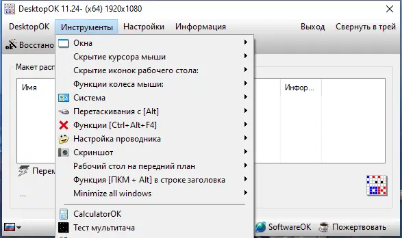 DesktopOK — легковесная портативная утилита для Windows, позволяющая сохранять и восстанавливать расположение иконок на рабочем столе после смены разрешения экрана или перезагрузки системы. Программа не требует установки, работает в фоне и поддерживает автосохранение настроек. Подходит для пользователей, часто подключающих внешние мониторы, проекторы или изменяющих параметры отображения.