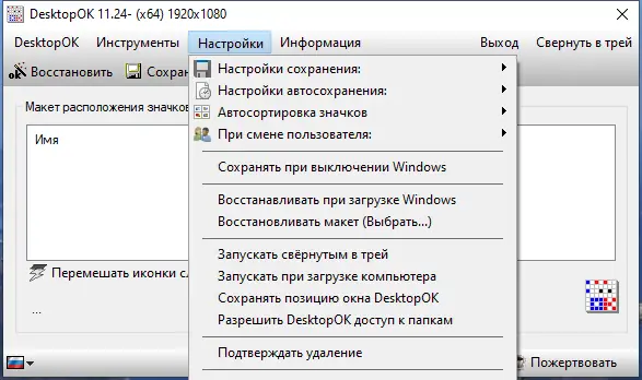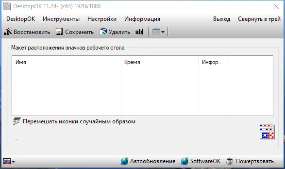 Использование DesktopOK предельно простое: после запуска приложение автоматически начинает отслеживать текущее состояние рабочего стола. Пользователь может вручную сохранить текущее расположение иконок, выбрав соответствующую опцию в контекстном меню или через интерфейс. При изменении разрешения экрана достаточно выбрать нужный профиль, и все ярлыки вернутся на свои места. Также доступна функция автоматического сохранения, которая активируется по таймеру или при каждом изменении позиций.
