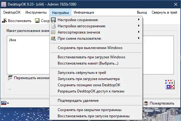 - Автоматическое сохранение позиций иконок в заданный интервал времени