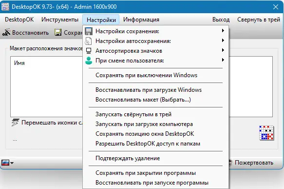 Использование программы не требует специальных навыков. После запуска DesktopOK автоматически отслеживает текущее состояние рабочего стола и при необходимости сохраняет его. Для ручного сохранения позиций иконок нужно нажать кнопку «Сохранить» в главном окне. При изменении разрешения экрана можно воспользоваться функцией «Восстановить», чтобы вернуть ярлыки на прежние места. Также доступна опция автосохранения, которая активируется в настройках и работает в фоновом режиме. Через меню «Инструменты» можно быстро скрыть иконки, свернуть окна или изменить размер значков.