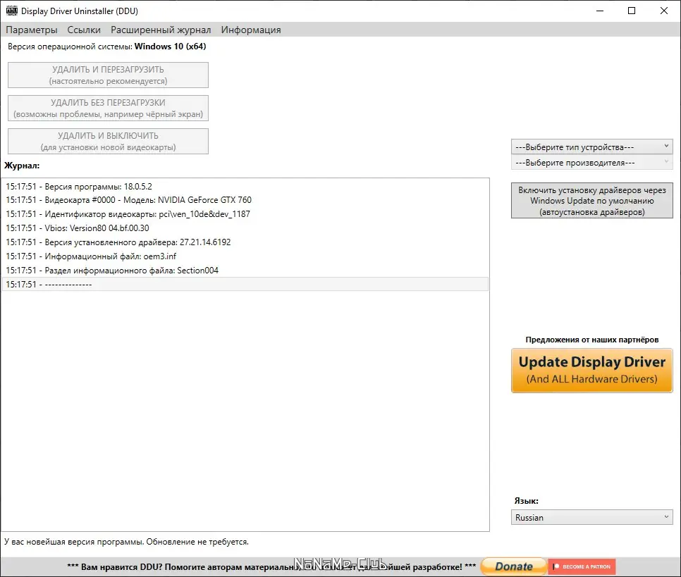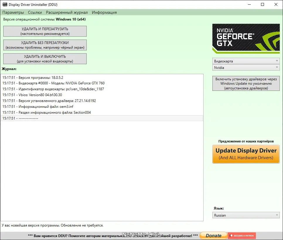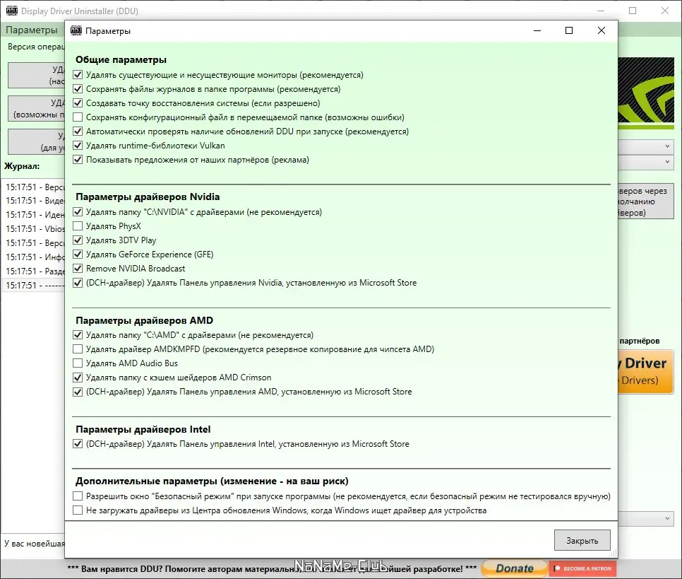 - Полное удаление драйверов AMD и NVIDIA, включая все вложенные компоненты и сервисы.