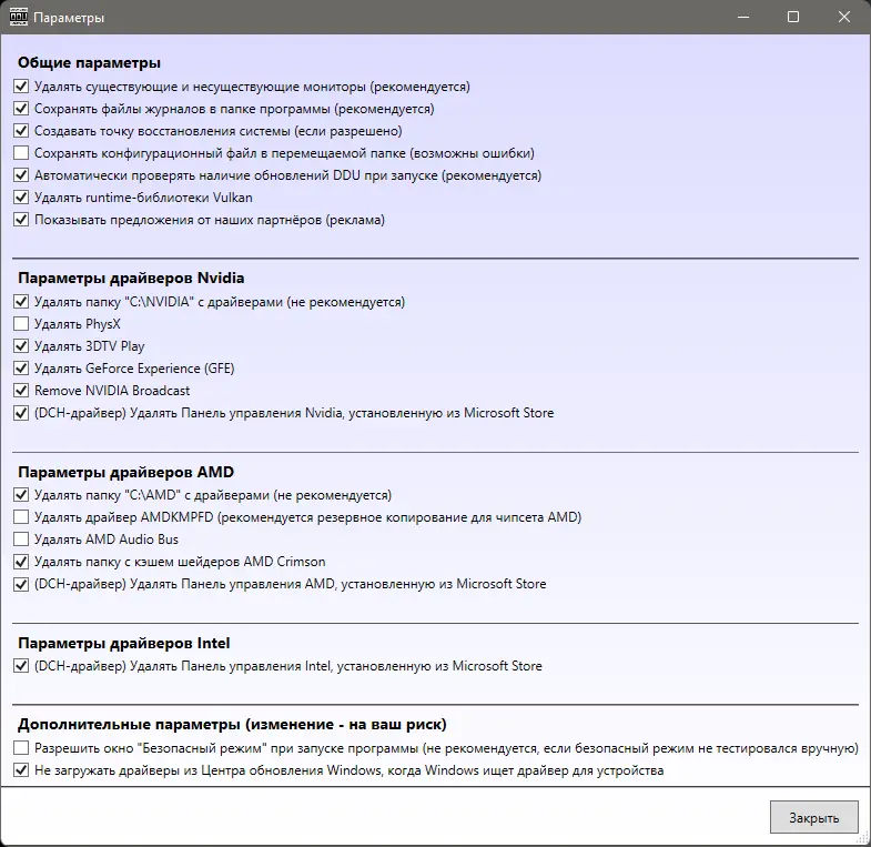 - Полное удаление всех компонентов драйверов AMD и NVIDIA, включая остаточные файлы и записи в реестре Windows.