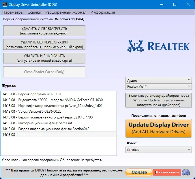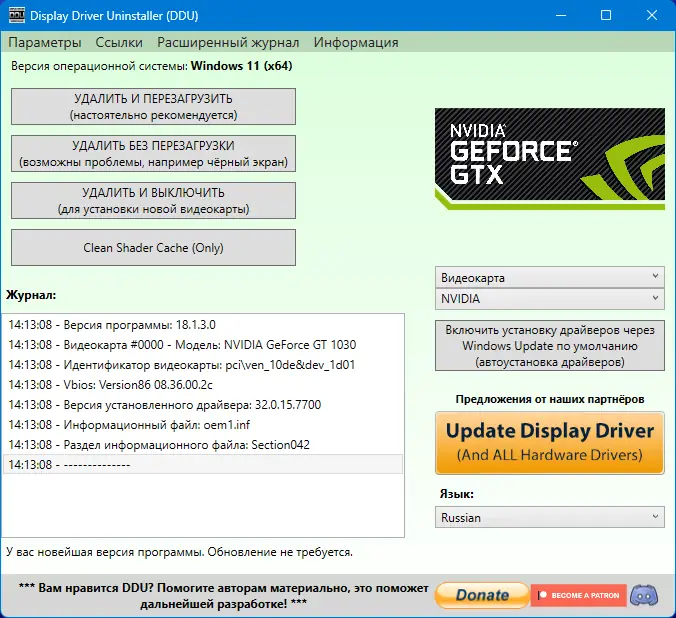 - Возможность удалить как текущий, так и ранее установленные драйверы.