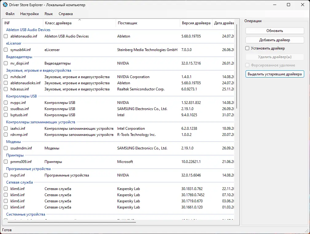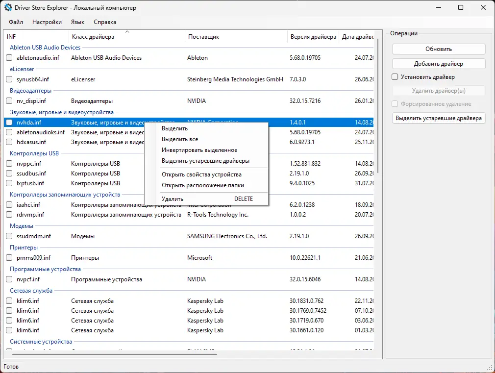 - Удаление нескольких драйверов одновременно, включая принудительное удаление