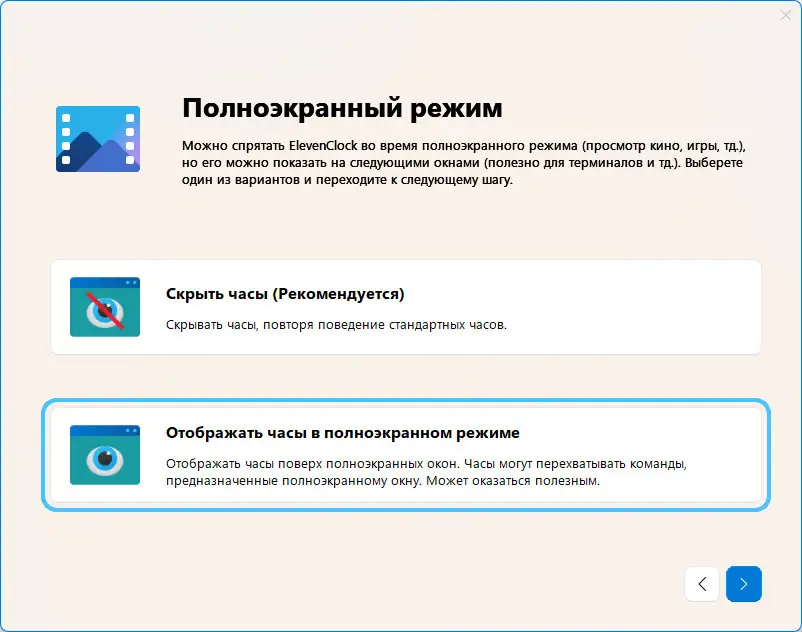 - Настройка поведения: часы могут оставаться видимыми даже при работе в полноэкранном режиме