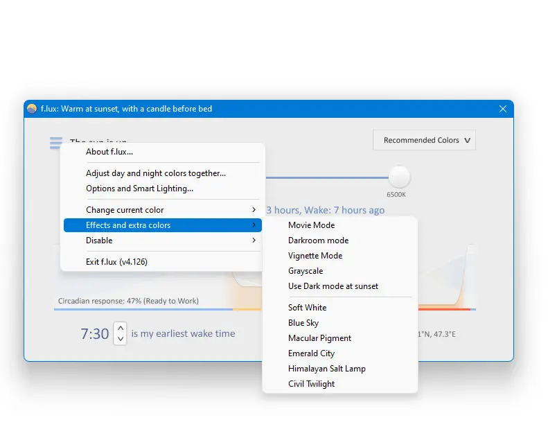 f.lux — приложение, которое автоматически регулирует цветовую температуру экрана в зависимости от времени суток, снижая нагрузку на глаза и способствуя более естественному восприятию изображения. Программа подстраивает оттенки под текущее освещение в помещении, делая работу за компьютером комфортнее, особенно в вечерние и ночные часы. Благодаря точному определению географического положения, утилита адаптируется к местному рассвету и закату, обеспечивая плавные переходы между режимами.