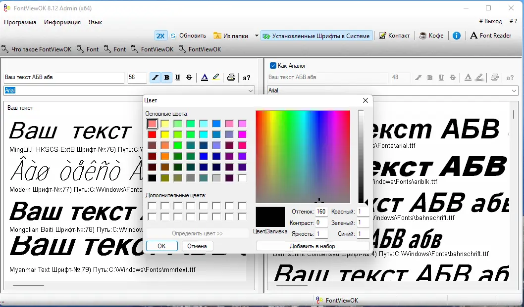 FontViewOK — компактное приложение для просмотра и управления установленными шрифтами в системе, позволяющее быстро оценивать внешний вид текста в различных типах начертания с возможностью настройки размера, цвета и стиля.