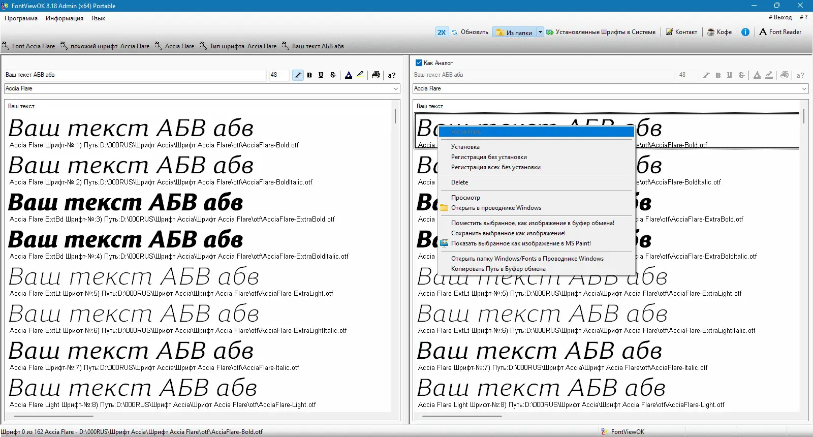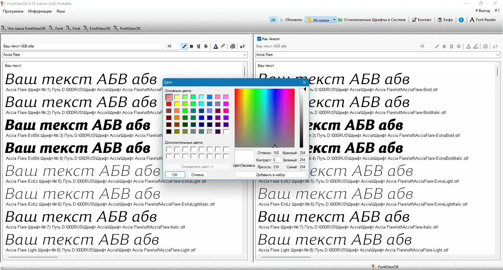 FontViewOK — компактное приложение для просмотра и сравнения установленных шрифтов с возможностью настройки текста, цвета, размера и стиля в реальном времени.