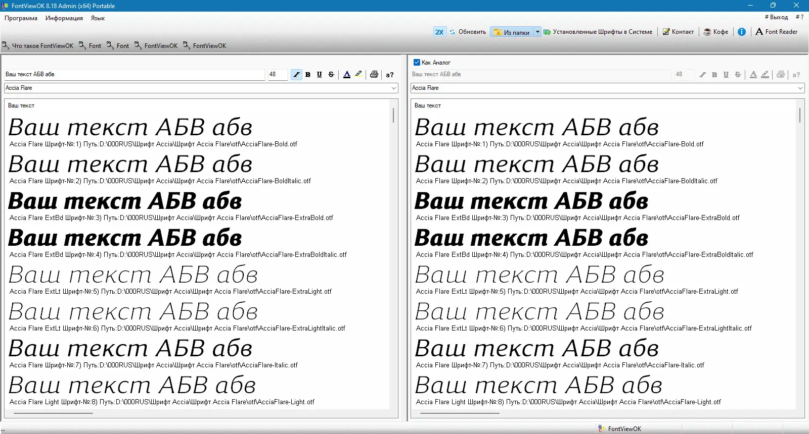 - Удобное сравнение шрифтов в двух панелях