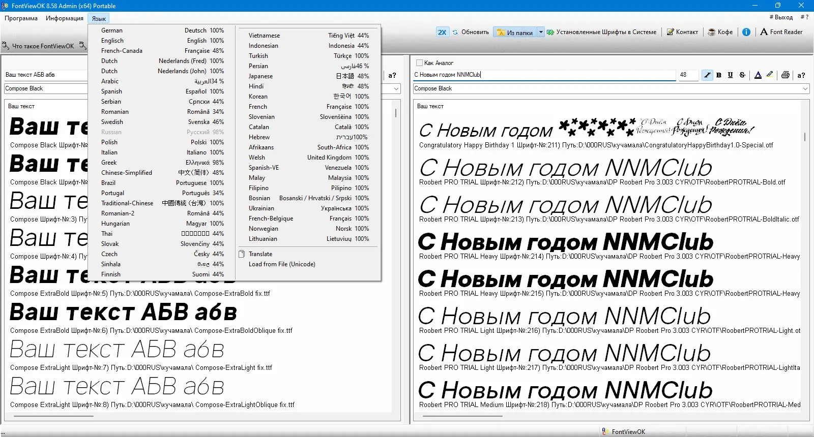 - Два независимых окна для параллельного сравнения различных шрифтов