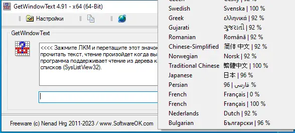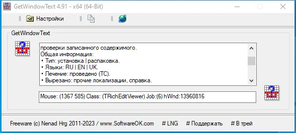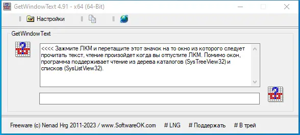 Использование программы предельно простое: после запуска появляется небольшое окно с иконкой. Пользователю необходимо перетащить эту иконку на нужный элемент интерфейса другого приложения, например, на строку в списке или пункт меню. Если текст доступен для чтения на уровне операционной системы, он немедленно отобразится в окне GetWindowText и станет доступен для копирования в буфер обмена. Процесс не требует дополнительных настроек и работает мгновенно, что делает утилиту удобной даже для новичков.