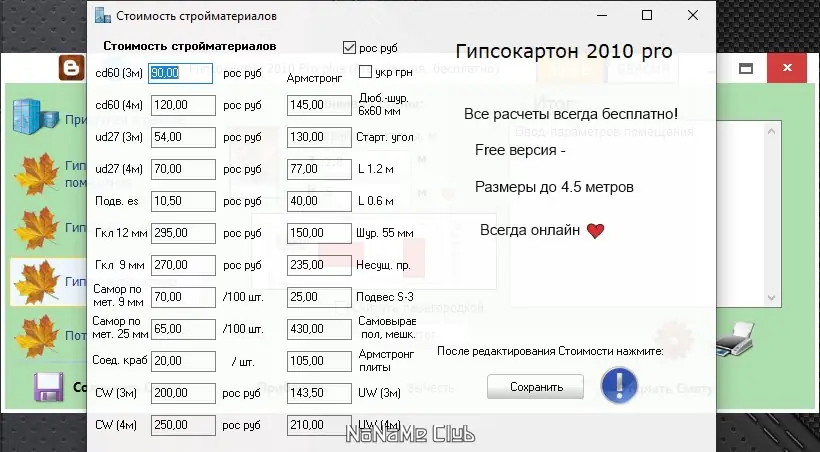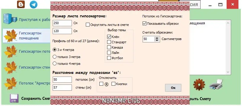Интерфейс программы интуитивно понятен и не требует глубоких технических знаний. Пользователь вводит габариты помещения, выбирает тип конструкции — стена, потолок или многоуровневая система. Далее задаются параметры профилей, шаг обрешётки, наличие инженерных коммуникаций и точечных элементов. Программа автоматически рассчитывает необходимое количество ГКЛ, направляющих и стоечных профилей, дюбель-шурупов и подвесов. Также доступна настройка стоимости материалов, что позволяет формировать точную смету с учётом региональных цен.