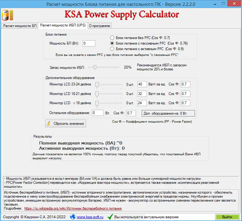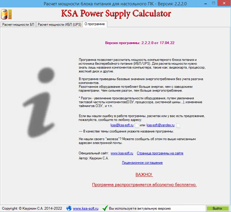 KSA Power Supply Calculator WorkStation — это компактная утилита для точного расчёта необходимой мощности блока питания компьютера и источника бесперебойного питания с учётом всех компонентов системы и периферийного оборудования.