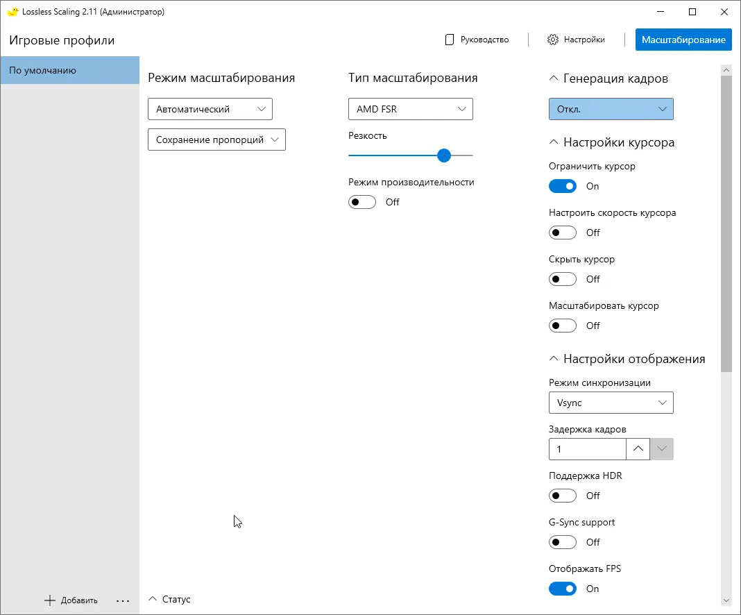 - Поддержка масштабирования через FSR и другие алгоритмы повышения качества изображения