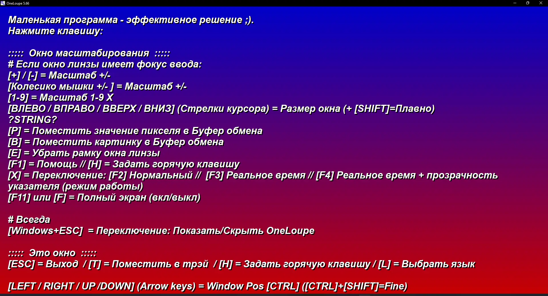 OneLoupe — это компактная и функциональная экранная лупа для детального рассмотрения мелких элементов на экране. Программа не требует установки, работает на всех актуальных версиях Windows и позволяет быстро увеличивать любой участок дисплея. Утилита подойдёт дизайнерам, разработчикам, пользователям с ослабленным зрением и всем, кому нужно точное визуальное масштабирование.
