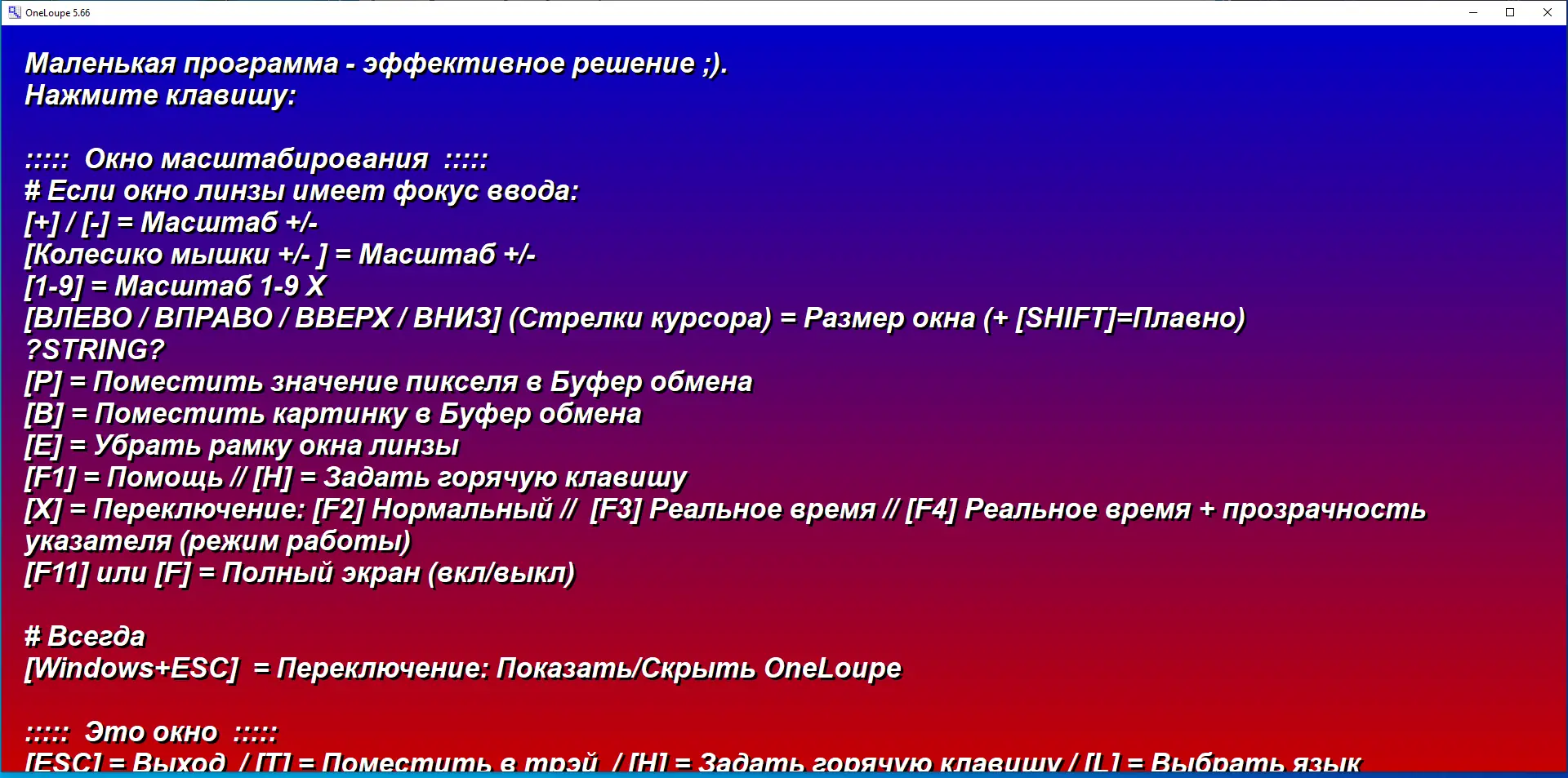 OneLoupe — это компактная и функциональная экранная лупа, предназначенная для увеличения фрагментов изображения на экране. Программа помогает детально рассмотреть мелкие элементы интерфейса, текст или графику без необходимости приближаться к монитору. Утилита проста в использовании и не требует сложной настройки.