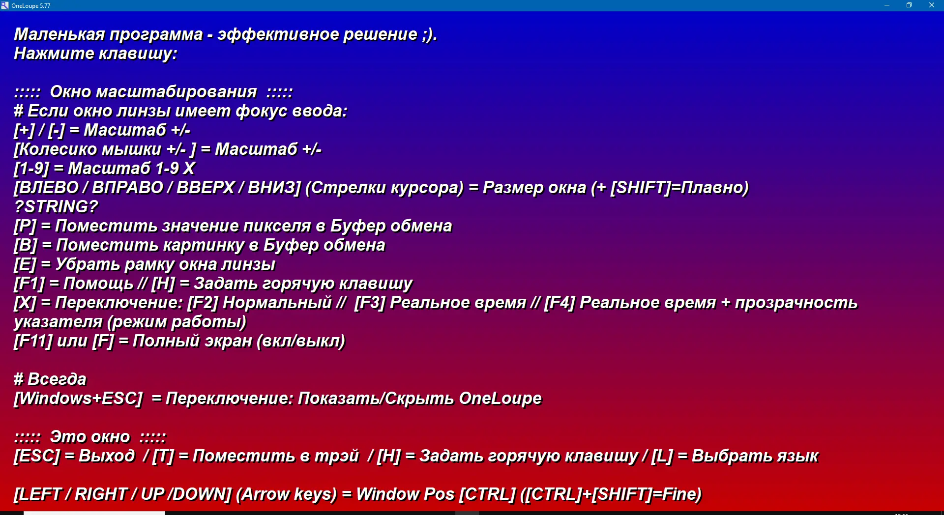 OneLoupe — это компактная и эффективная утилита, выполняющая функции экранной лупы. Программа помогает увеличивать фрагменты изображения на мониторе для детального рассмотрения мелких элементов интерфейса, текста или графики. Лёгкое приложение не требует установки и работает на всех актуальных версиях Windows.