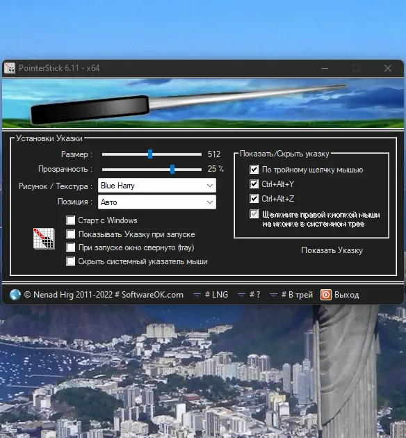 - Поддерживает настройку размера, прозрачности и текстуры указателя