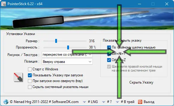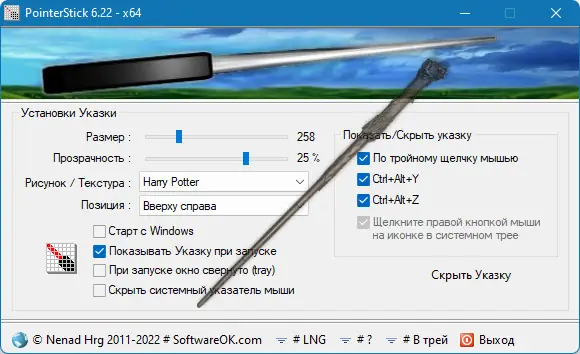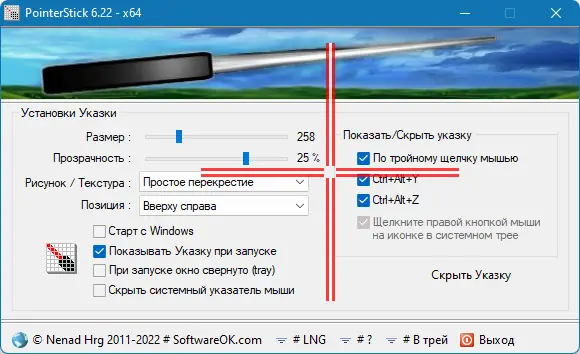Запуск программы происходит в один клик — после старта указатель мыши автоматически преобразуется в увеличенную указку. Управление осуществляется через сочетания клавиш: можно временно скрыть указку или переключиться между режимами отображения. Все настройки доступны в фоновом режиме, изменения применяются мгновенно, без необходимости перезапуска.