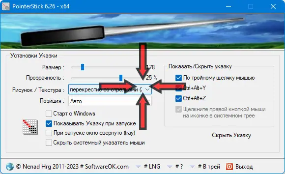 - Поддерживает настройку размера, прозрачности и текстуры указателя