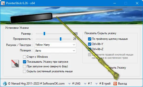 Запуск программы не требует установки — достаточно запустить исполняемый файл. После старта указатель мыши автоматически изменяется на увеличенную указку, настройки которой можно корректировать в реальном времени. Для временного скрытия указки используется комбинация клавиш, указанная в настройках, что позволяет быстро переключаться между обычным и презентационным режимом. Все изменения сохраняются в файле PointerStick.ini, который можно переносить вместе с программой.