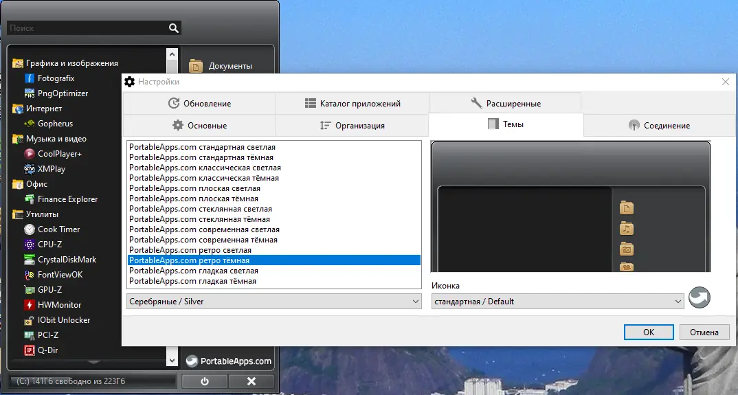 - Гибкая настройка интерфейса включает выбор тем, цветовых схем и персональных изображений.