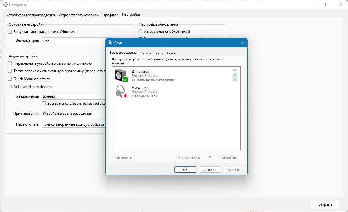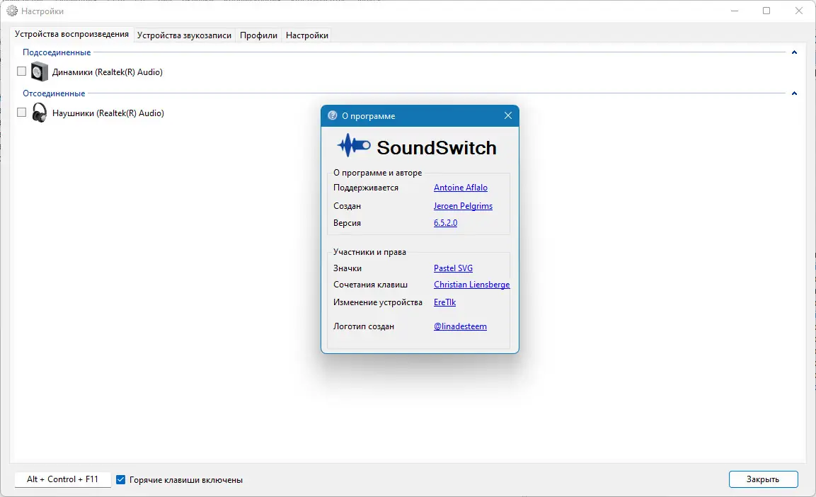 SoundSwitch — это бесплатная утилита для Windows, позволяющая быстро переключаться между аудиоустройствами с помощью горячих клавиш. Программа идеально подходит для пользователей, использующих несколько наушников, колонок, микрофонов и других периферийных устройств. Упрощает управление звуком без необходимости заходить в системные настройки.