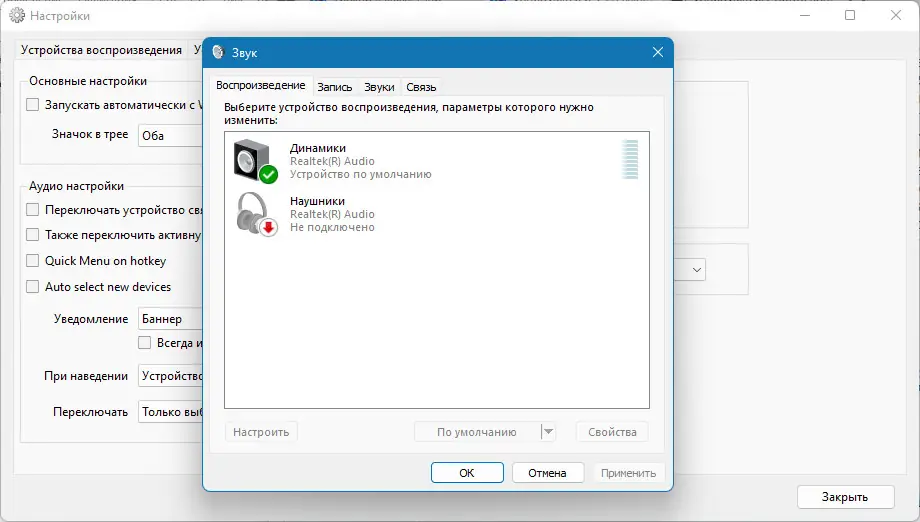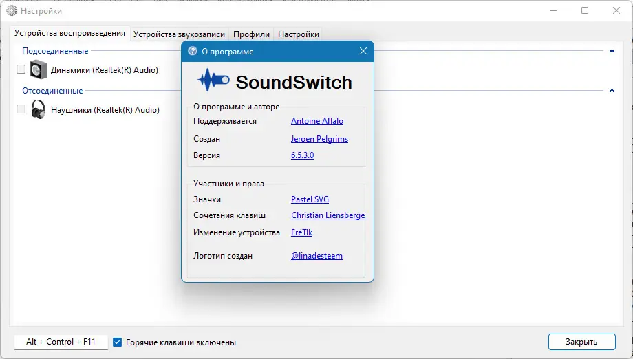 SoundSwitch — удобная утилита для быстрого переключения между аудиоустройствами на компьютере. Программа устраняет необходимость ручного выбора устройств воспроизведения и записи через системные настройки, заменяя это процессом с помощью горячих клавиш. Поддерживает широкий спектр устройств, включая наушники, колонки, микрофоны и аудиоинтерфейсы.