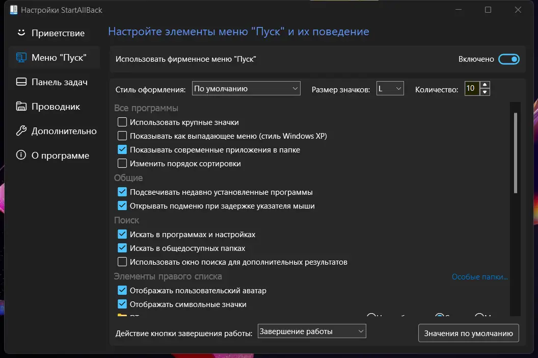 После установки StartAllBack автоматически применяет настройки по умолчанию, имитирующие классическое меню. Пользователь может открыть панель конфигурации через контекстное меню кнопки «Пуск» и выбрать нужный режим отображения. Доступны режимы для windows 11, режим «Приложения» вместо «Пуска», а также возможность отключения анимаций и прозрачности. Можно настроить поведение меню при клике, задать горячие клавиши и импортировать готовые профили через файл settings.reg. Все изменения применяются в реальном времени без перезагрузки системы, что ускоряет процесс настройки.