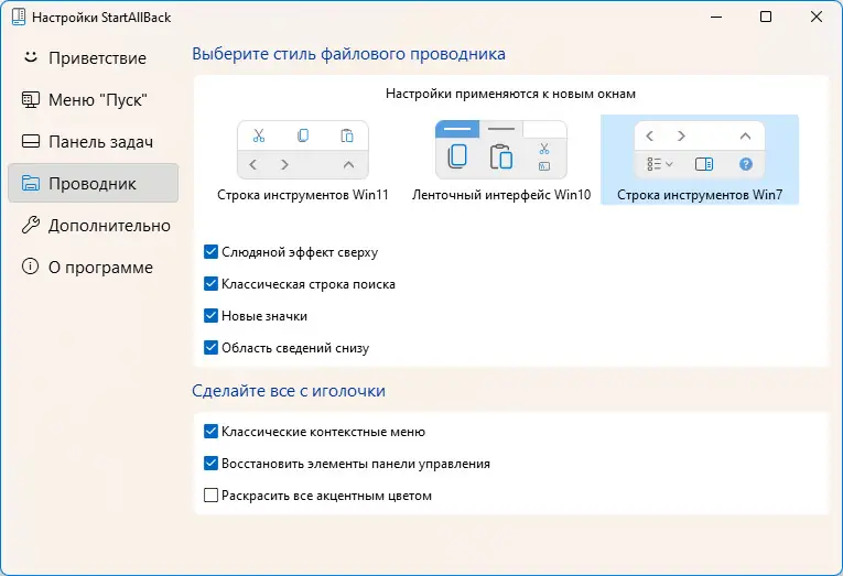 StartAllBack — это инструмент для тонкой настройки интерфейса операционной системы, который возвращает классическое меню «Пуск» в windows 11 и восстанавливает привычный порядок взаимодействия с рабочим столом. Программа идеально подойдёт пользователям, которым неудобен современный стиль оформления, и позволяет полностью отказаться от интерфейса Metro. Благодаря глубокой интеграции с системой, она работает стабильно и не требует сложной настройки.