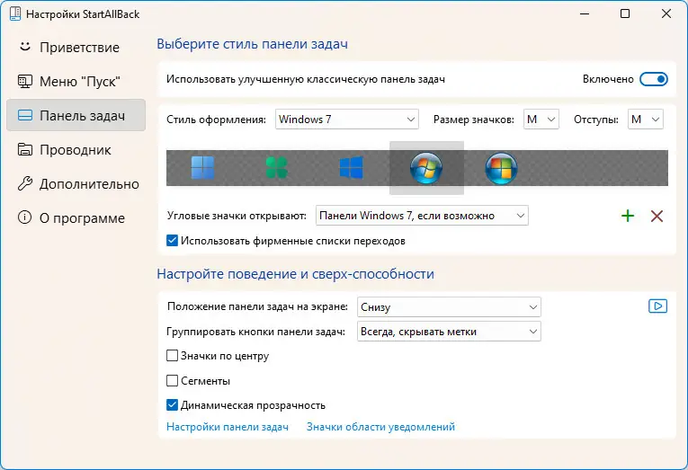 - Полностью заменяет современное меню «Пуск» на традиционное, аналогичное интерфейсу Windows 7.