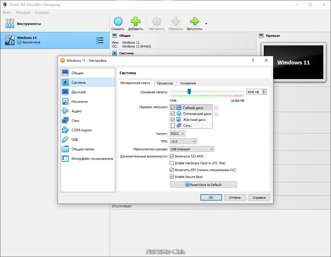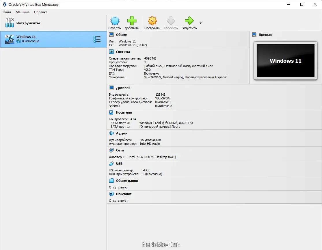 - Гибкая настройка параметров виртуальной машины, включая сеть, звук, видеокарту и USB-порты.